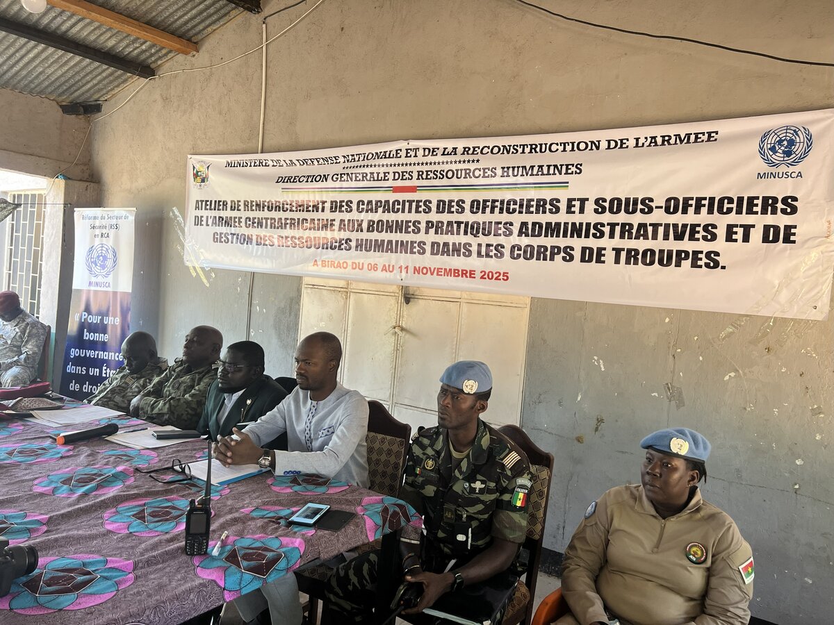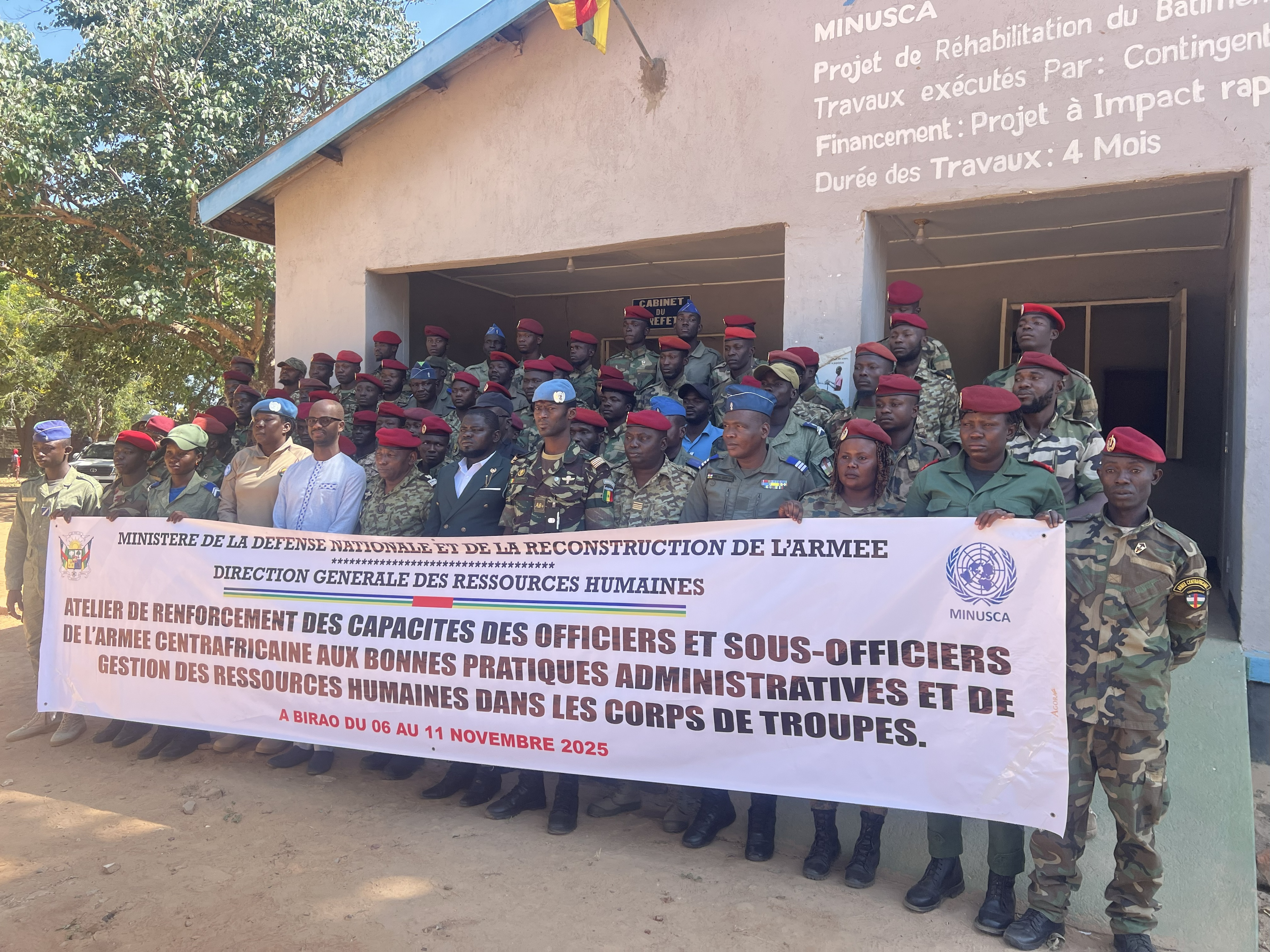 À Birao, dans la préfecture de la Vakaga, 70 officiers et sous-officiers des Forces armées centrafricaines (FACA), dont trois femmes, ont suivi, du 6 au 11 novembre 2025, une formation sur les bonnes pratiques administratives et la gestion des ressources humaines au sein des corps de troupe au cours d’un atelier organisé par le Ministère de la défense nationale avec le soutien de la MINUSCA.