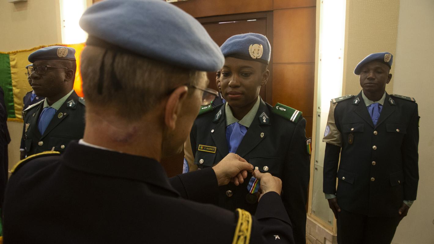 Addressing the recipients, contingent leader Diangnafla Diallo urged them to respect the principles of the United Nations in the pursuit of peace: ”The medals you are being awarded not only symbolize the recognition of the United Nations for your work but are also a call to redouble your efforts to carry the UN and Malian flags even higher.”