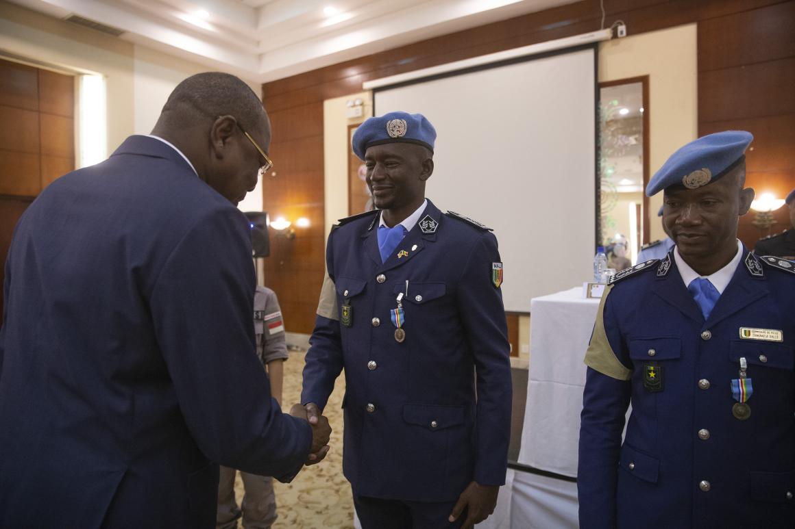 MINUSCA today held a medal ceremony for 15United Nations Police (UNPOL) officers fromMali in recognition of their work in the implementation of the Mission mandate in the Central African Republic.