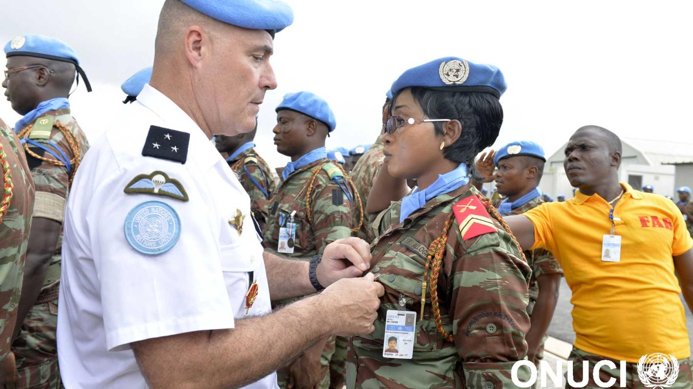 UNOCI Force Commander, General Didier L'Hôte decorates a female peacekeeper from the Benin Contingent with the UN Medal for good and loyal service to the United Nations Mission in Cote d'Ivoire (Abidjan, May 2016)