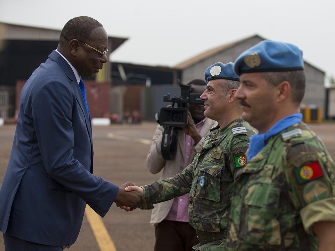 The CAR, UN and Portuguese anthems rang in the ceremony, setting the tone for a memorable congratulatory medal parade for the diverse group of men and women who had served the peacekeeping cause in CAR – in the presence of the MINUSCA Special Representative of the Secretary-General (SRSG) Mankeur Ndiaye, Deputy SRSG Denise Brown, Acting Force Commander Eduardo Mendes Ferrao as well as representatives from the European Union and the Government of the Central African Republic.