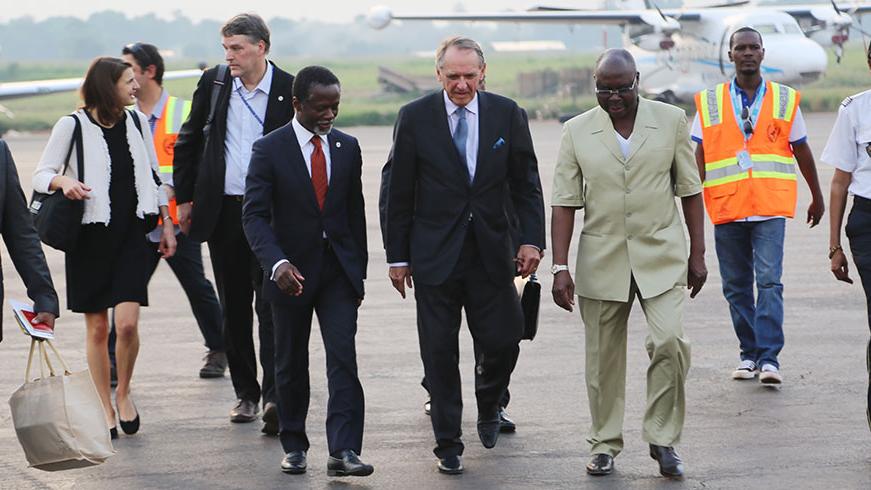 Jan Eliasson was welcomed upon arrival by the Special Representative of the Secretary-General and Chief of MINUSCA, Parfait Onanga-Anyanga, the Deputy Special Representative, Fabrizio Hochschild, and several other civilians, police and military officials of the United Nations.