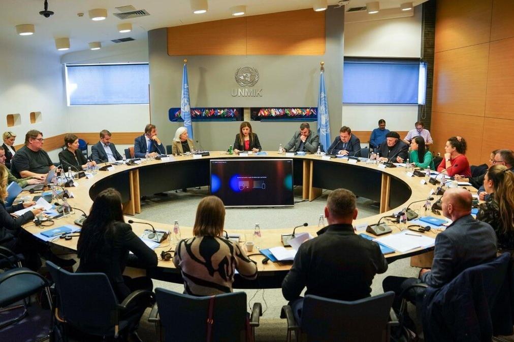 Large roundtable meeting with multiple participants seated around a curved conference table. UNMIK logo and two UN flags are visible in the background, with documents, microphones, and water bottles on the table.