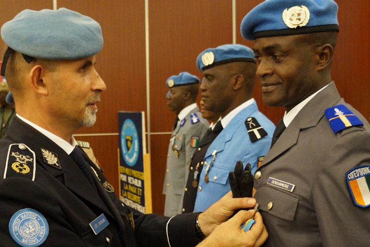 Ce vendredi 7 août 2015 a vu la remise, à Bangui, de la médaille de la MINUSCA à 18 policiers et 10 gendarmes ivoiriens du contingent de la Mission multidimensionnelle intégrée des Nations Unies pour la stabilisation en République centrafricaine (MINUSCA). C’était en présence du Représentant spécial adjoint du Secrétaire général des Nations Unies, Aurélien Agbénonci, par ailleurs Coordonnateur humanitaire et de Développement et Représentant résident du PNUD, du Commissaire de la Police de la MINUSCA, Luis Miguel Carrilho, et du commandant du contingent de la Côte d’ivoire, le Commissaire Lazare Surkulani.