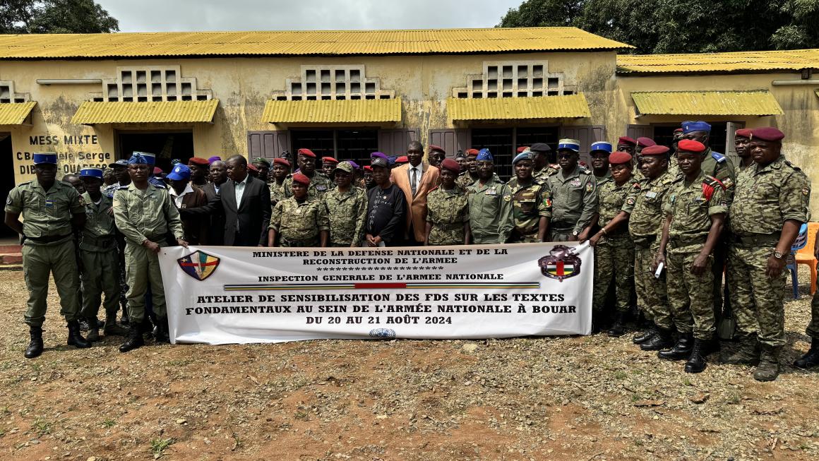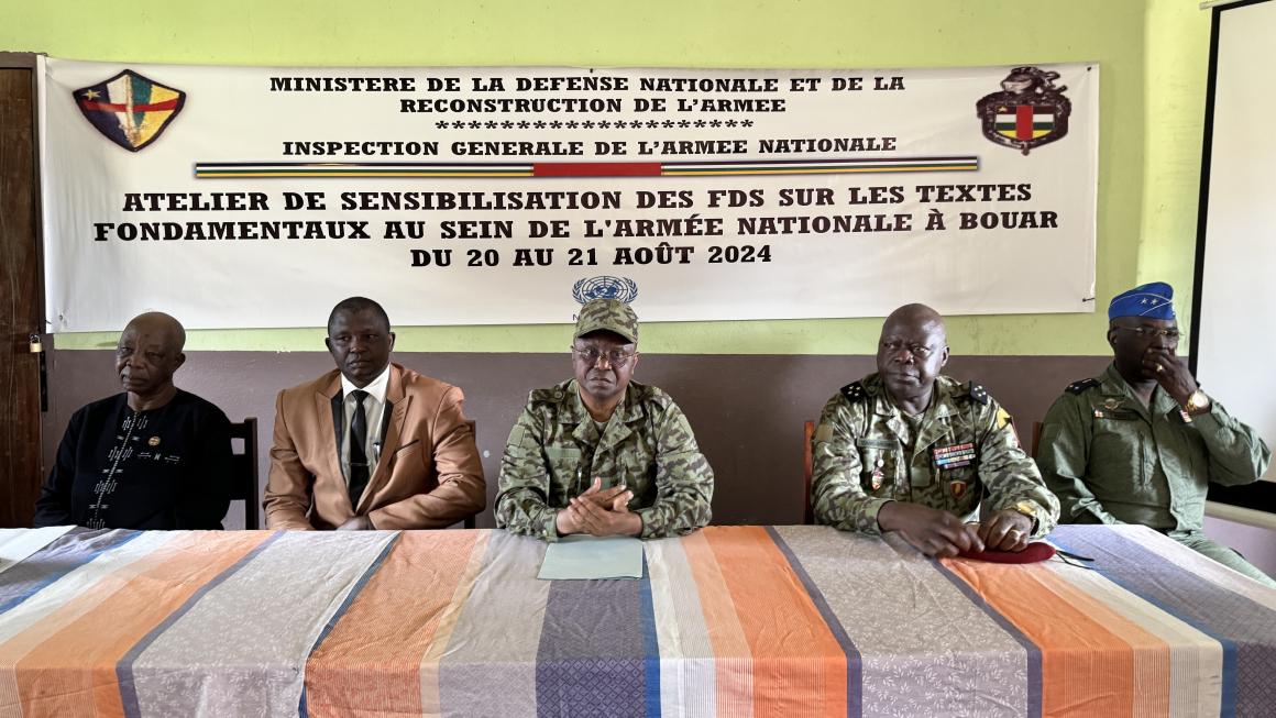 L’Inspection générale des Forces armées centrafricaines, avec l’appui de la MINUSCA, a organisé un atelier de sensibilisation aux textes fondamentaux et réglementaires au sein des Forces armées centrafricaines. Cet événement, qui se déroule du 20 au 21 août 2024 à Bouar, est présidé par le ministre de la Défense nationale et de la Reconstruction de l'Armée, Claude Rameaux Bireau. L’objectif est de promouvoir la discipline et de renforcer une culture de responsabilité au sein des Forces de défense et de sécurité nationales.