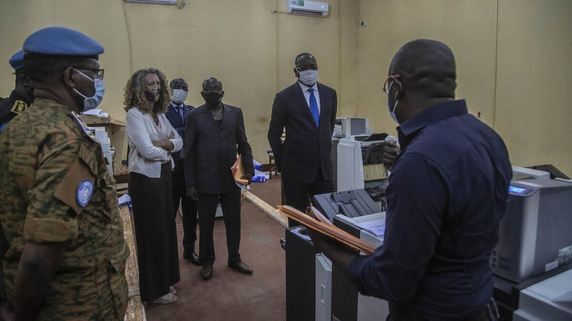 En vue de s’imprégner du travail de l'Agence Nationale des Elections (ANE) en matière de gestion d’informations relatives au fichier électoral, une délégation conduite par le Représentant spécial du Secrétaire général des Nations Unies et Chef de la MINUSCA, Mankeur Ndiaye, s'est rendue, mardi 13 octobre 2020, au centre de traitement des données (CTD) électorales.