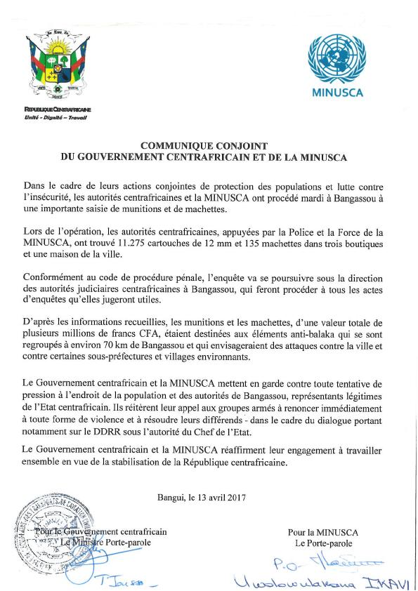 AccueilMINUSCA Communiqué conjoint du Gouvernement-MINUSCA relatif à une importante saisie de munitions et de machettes 13 avril 2017Communiqués de pressePartagerCommuniqués de presse