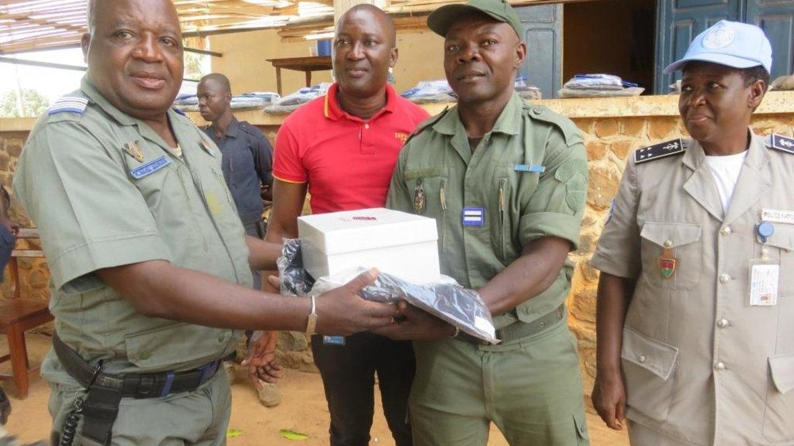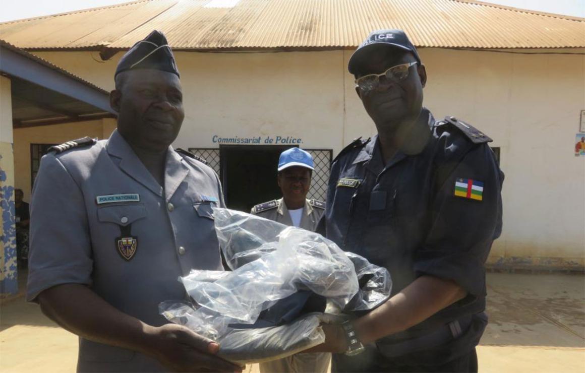Le gouvernement centrafricain, avec l’appui de partenaires internationaux, s’investit dans le renouvèlement les tenues des Forces de sécurité intérieure (FSI). A cet effet, une mission conjointe, composée des FSI, du PNUD et de la Police des Nations Unies (UNPol) de la MINUSCA, a procédé le lundi 1er avril 2019 à Bossangoa, à la remise de nouveaux équipements composés d’uniformes, des paires de chaussure et des accessoires (écussons, calots, ceinturons et casquettes) aux policiers et aux gendarmes de la Préfecture de l’Ouham.