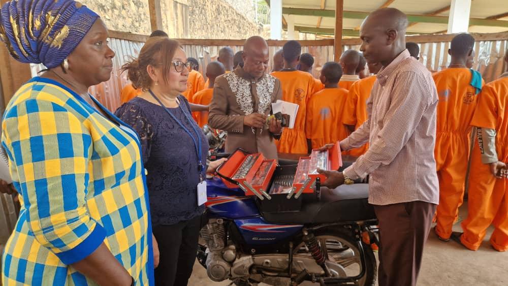 Le 4 décembre 2024, à Bangui, deux initiatives marquantes, soutenues par la MINUSCA, ont été lancées en faveur de la réinsertion sociale des détenus en République centrafricaine. La première concerne la formation professionnelle en mécanique moto, destinée à 20 détenus mineurs de la Maison Centrale de Ngaragba, et la seconde concerne les femmes détenues des Maisons d'arrêt de la République centrafricaine qui ont exposé et vendu leurs produits lors d'une foire organisée à Bangui.