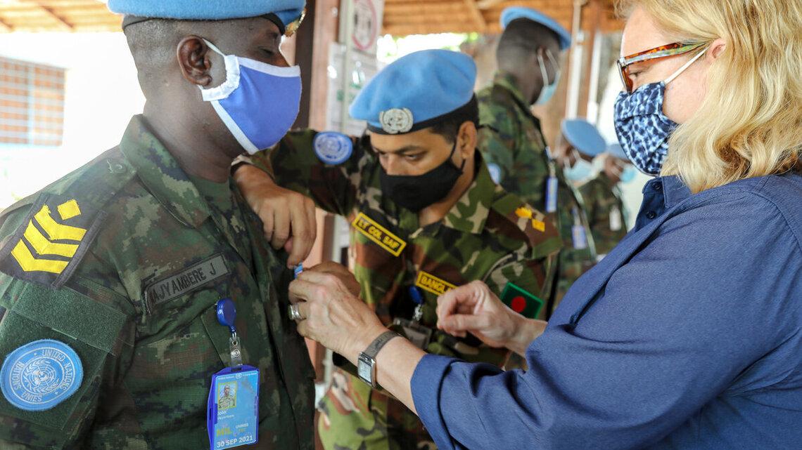 En reconnaissance à leur effort de soutien, la 5e Unité d’aviation de l'armée du Sri Lanka et des deux compagnies d'infanterie du Rwanda (RWABATT) de la Mission des Nations Unies au Soudan du Sud (MINUSS), déployées à la MINUSCA depuis décembre 2020, dans le cadre d’une coopération intermissions, ont été décorées de la médaille des Nations Unies, le 21 avril 2021 à Bangui.