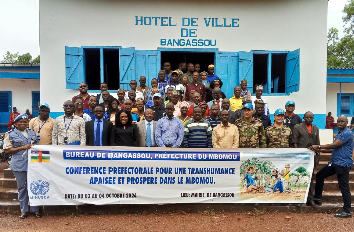 Les 3 et 4 octobre 2024, la mairie de Bangassou a accueilli la Conférence préfectorale pour une transhumance apaisée, organisée par les autorités locales en partenariat avec la MINUSCA. L'événement a réuni 70 participants, dont 13 femmes, venus des cinq sous-préfectures du Mbomou. Éleveurs, agriculteurs, ONG et leaders communautaires ont discuté des solutions pour apaiser les tensions liées à la transhumance, un enjeu crucial pour la cohésion sociale de la région.