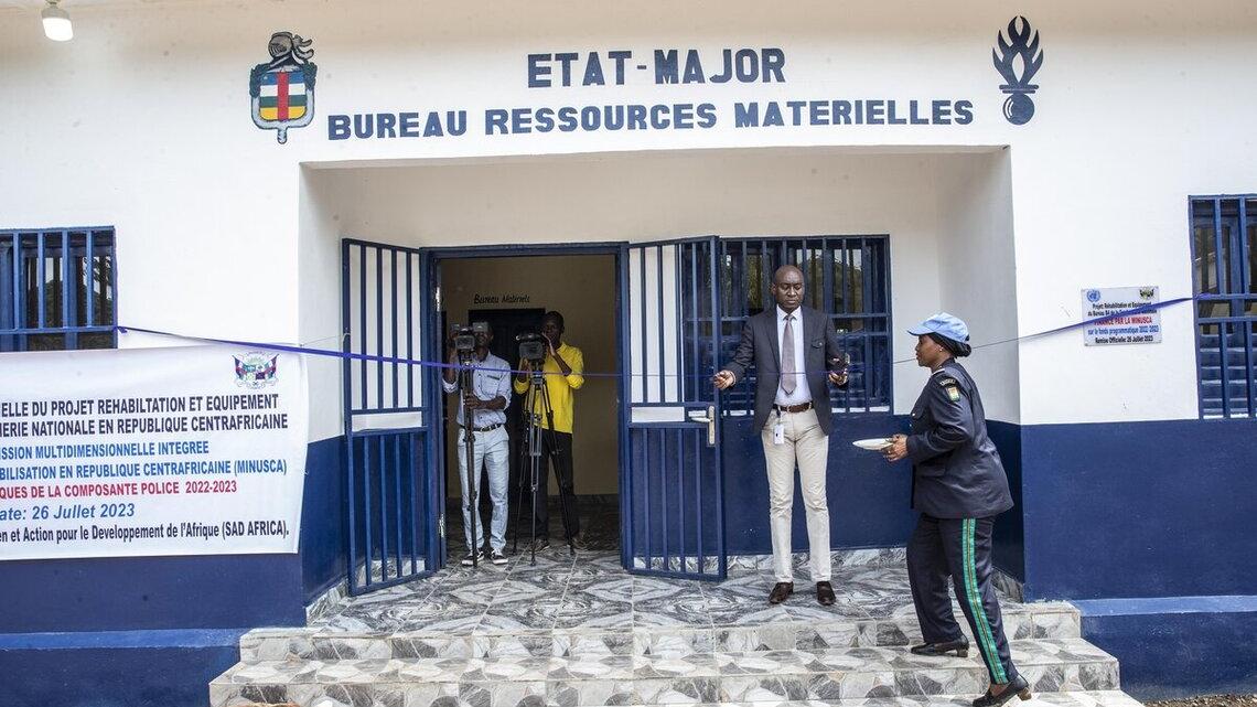 Des bâtiments de l'Etat-major de la Gendarmerie nationale réhabilités et équipés par la MINUSCA ont été remis aux autorités, ce 26 juillet 2023, à Bangui. Ces réalisations ont pour but de renforcer les capacités des Forces de sécurité intérieure (FSI) conformément au Plan de Renforcement des Capacités et de Développement des FSI, et de soutenir l’extension de l’autorité de l’Etat sur toute l’étendue du territoire centrafricain, conformément au mandat de la Mission.