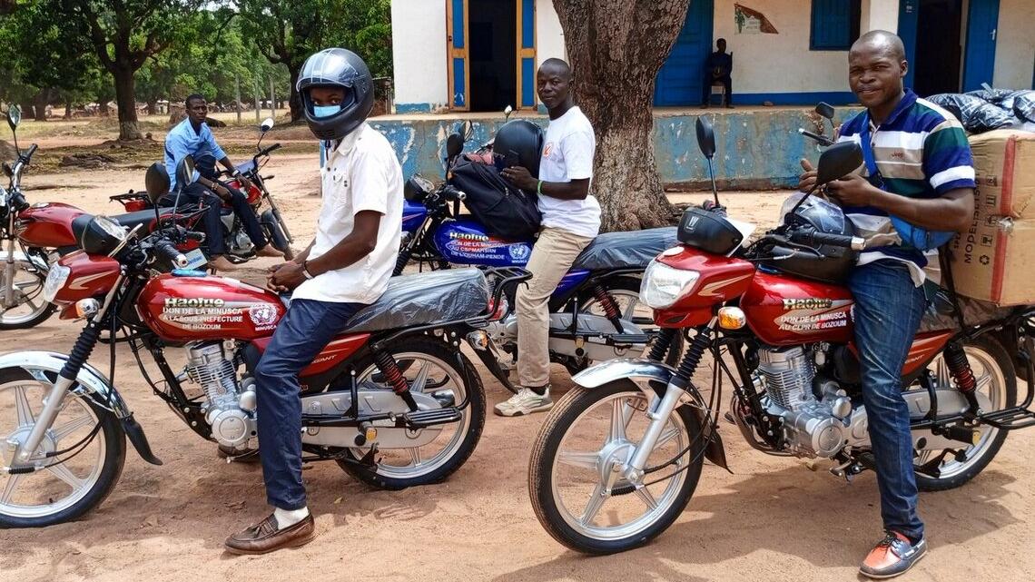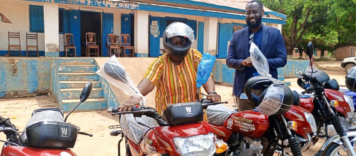 Le 26 avril 2025 à Paoua (dans la préfecture de Lim-Pendé), la MINUSCA a remis neuf motos, des kits de communication et d’autres matériels de visibilité (boomers, casquettes et tee-shirts) aux sous-préfets et aux membres des comités locaux de paix dans le cadre de l’extension de l’autorité de l’État et pour une transhumance apaisée.
