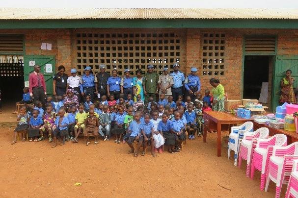 Dans le cadre des activités organisées en marge de la célébration de la Journée Internationale des Casques Bleus, le 29 Mai 2017, la MINUSCA, à travers le réseau des femmes de sa composante Police, a organisé un diner caritatif. Une façon pour la composante Police d’apporter un peu de sourire à ces enfants. Les fonds récoltés – quelque 608.755 francs CFA- ont été utilisés pour un don au bénéfice des enfants défavorisés de l’École maternelle Mandaba, située dans le 4ème arrondissement de Bangui. Le 13 juin 2017, une délégation de la MINUSCA, conduite par le Commissaire Adjoint, Souleymanou Ngamsou, s’est rendue sur le site de l’école pour effectuer la remise de ces dons.