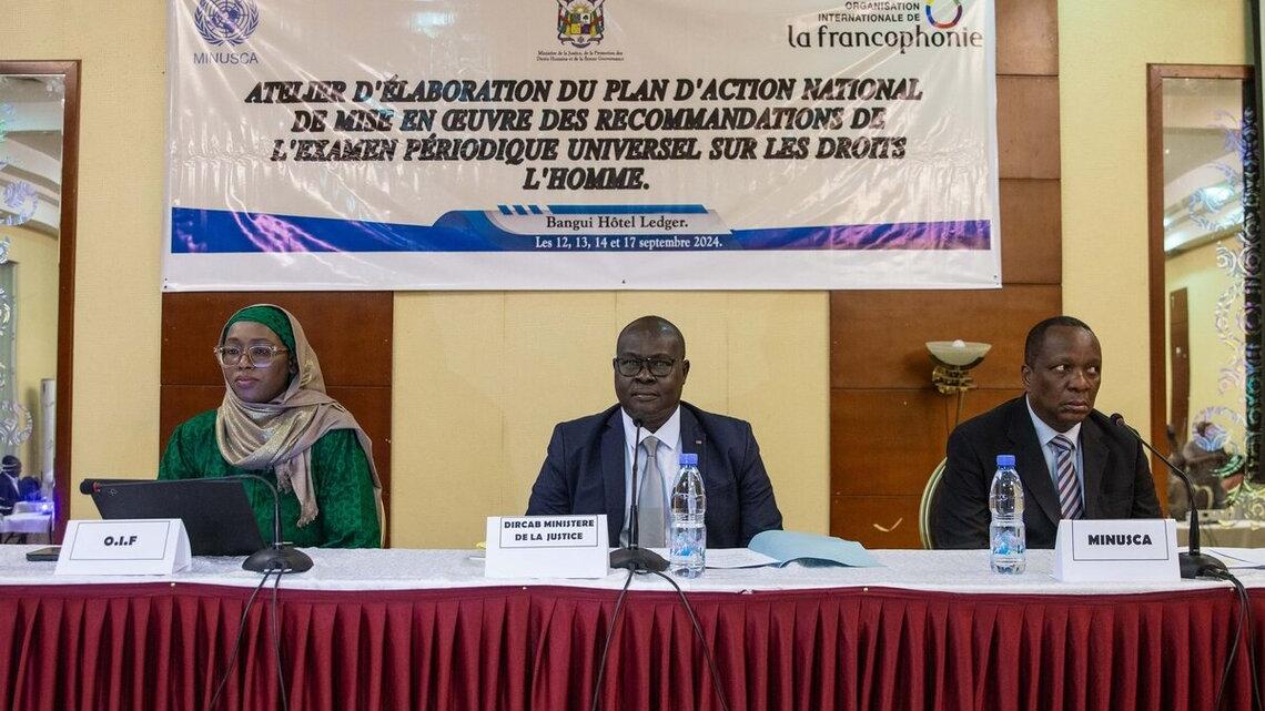 Pierre Emmanuel Ubalijoro, représentant la Cheffe de la MINUSCA à cet atelier, a réaffirmé le soutien des Nations Unies au Gouvernement centrafricain pour la mise en œuvre du plan d’action : « J’en appelle donc à tous les acteurs présents dans la salle afin de réunir leurs efforts pour faciliter l’adoption d’un plan d’action qui réponde aux aspirations légitimes de la population centrafricaine. C’est à cet égard que les Nations Unies poursuivront leur coopération stratégique avec le Gouvernement et renforceront les objectifs communs, qui en matière des droits de l’homme, visent l’amélioration de la situation des droits de l’homme, et l’éclosion d’un espace civique compatible à l’Etat de droit », a-t-il affirmé.