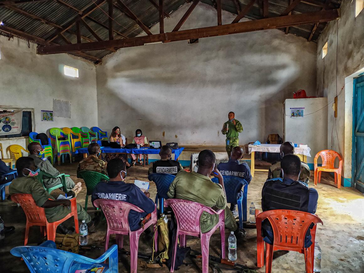Lors des échanges du 27 mars 2021, les FACA et FSI ont mis de côté leurs armes, à la faveur des casques bleus camerounais qui veillent. L’Etat d’urgence est toujours en vigueur, il faut tout faire pour éviter un incident. Le Commandant du 5e groupement de Gendarmerie, le Lieutenant Yan Tchikaya a tenu à être présent pour suivre les débats, mais aussi participer. C’est un homme d’expérience, ses questions sont tranchantes, mais permettent d’élever le niveau des échanges avec les représentants de la MINUSCA. Pour ce dernier, « c’est une opportunité de travailler avec nos partenaires, mais aussi de pouvoir poser de vraies questions, directement ». Ces ateliers, qui prennent souvent la forme d’un débat, permettent de faire comprendre ce qu’est une violation des droits de l’homme la question de la protection des femmes et des enfants. C’est aussi l’occasion pour la MINUSCA de présenter son mandat.