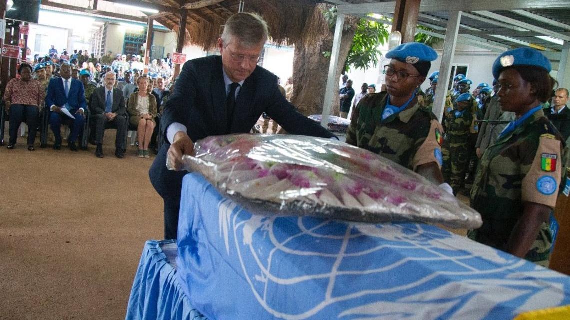 « Ces braves soldats sénégalais qui sont ici devant nous et dont nous saluons la mémoire mesuraient bien tous ces risques et savaient que c’était toujours au péril de leur vie qu’ils accomplissaient leur mission. Néanmoins, à chaque fois que le devoir les appelait, à chaque fois qu’une mission de protection des populations leur était donné, ces hommes d’honneur et du devoir répondaient toujours présents, bravant les intempéries, l’hostilité des groupes armés et de l’environnement opérationnel pour accomplir leur mission avec un professionnalisme sans faille et une disponibilité permanente», ainsi rendait hommage le Secrétaire général adjoint des Nations unies, en charge des Opérations de paix, Jean-Pierre Lacroix, aux trois casques bleus de la Compagnie d’aviation sénégalaise de la MINUSCA décédés dans l’accident de leur hélicoptère, le 27 septembre 2019 à Bouar.