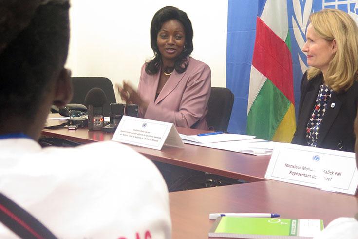 « Que devrait faire le gouvernement centrafricain et la MINUSCA pour assurer la sécurité des enfants en Centrafrique? » ou encore : « Que prévoit le gouvernement et l’Unicef pour améliorer le système éducatif en Centrafrique » Voilà quelques-unes des questions que des enfants de différents établissements scolaires de Bangui ont posé aujourd’hui à la Représente Spéciale Adjointe du Secrétaire général des Nations Unies, Diane Corner, au ministre des Affaires sociales et de la réconciliation, Virgine Mbaïkoua, et au Représentant de l’UNICEF, Mohammed Malick Fall.