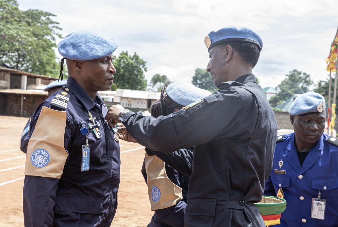 En reconnaissance de leur contribution en tant que membres de la composante Police de l’ONU à la sécurisation de la ville de Bangui, 140 membres de l’Unité camerounaise de Police constituée de la MINUSCA, dont 20 femmes, ont reçu le 20 mai 2024 la médaille des Nations Unies.