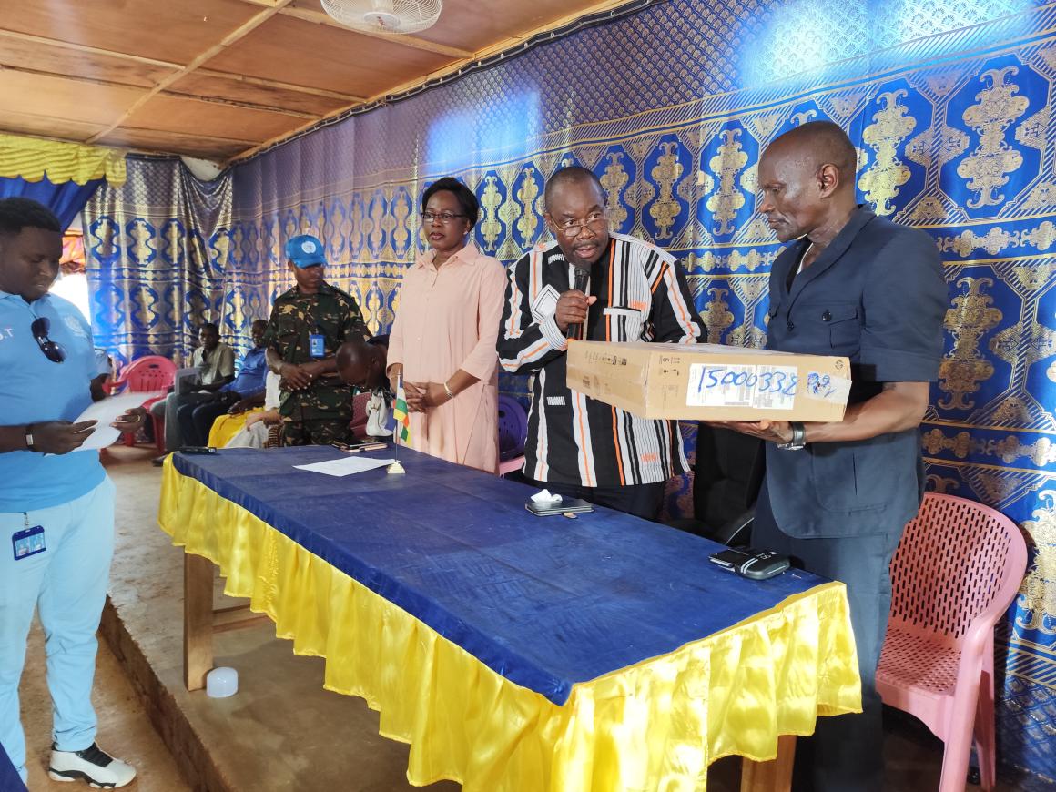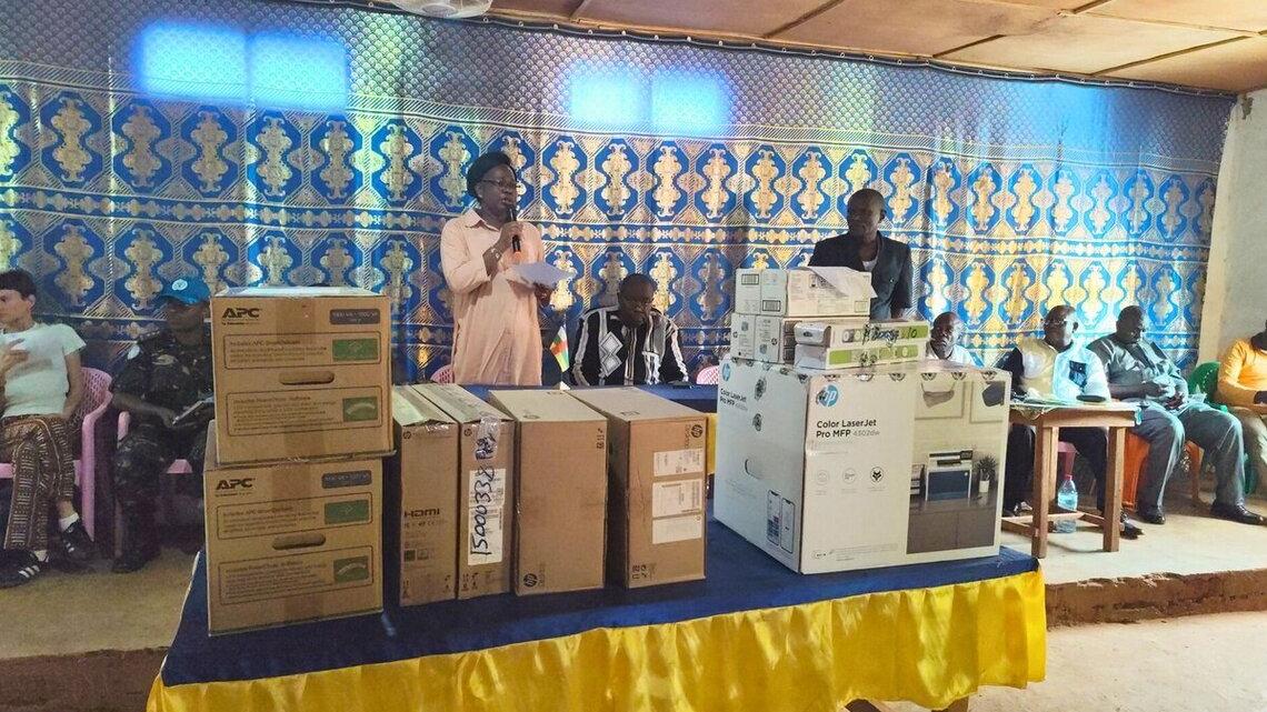 Dans le cadre de la vulgarisation de l’APPR-RCA et de la feuille de route de Luanda, considérés comme le cadre unique pour le retour de la paix en République centrafricaine, la MINUSCA a fait un don de matériel bureautique et informatique au Comité de mise en œuvre préfectoral (CMOP) de Nola (Sangha-Mbaéré), le 18 octobre 2024. Cette remise s’est déroulée en présence du Gouverneur de l'Équateur, Martial Dindi Bamongo.