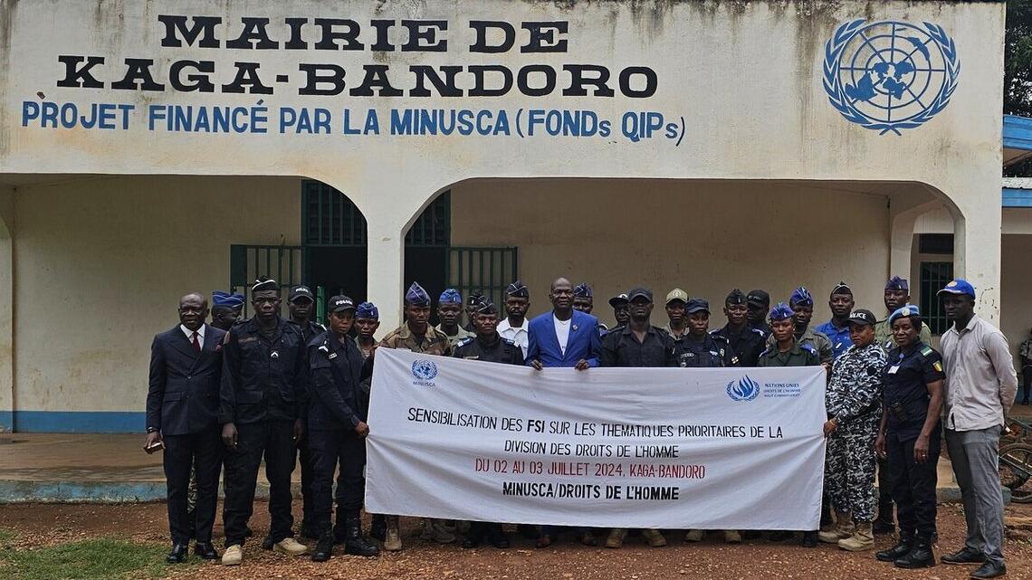 Dans le cadre de ses efforts continus pour promouvoir les droits de l'homme et renforcer l’accès à la justice, la MINUSCA, en partenariat avec les autorités locales, a organisé du 2 au 5 juillet 2024 à Kaga Bandoro une série de formations à destination des représentants des Forces de sécurité intérieure (FSI) et des membres du forum local des droits de l'homme. Ces formations visaient à renforcer les capacités locales pour une gouvernance judiciaire transparente.
