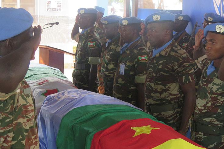 Le Caporal Daniel Nsengiyumva et l’Adjudant Golof CHI MIH, respectivement originaires du Burundi et du Cameroun, ont reçu les honneurs militaires, ce vendredi 13 novembre 2015 au quartier général de la Mission multidimensionnelle intégrée des Nations Unies pour la stabilisation en République centrafricaine (MINUSCA).