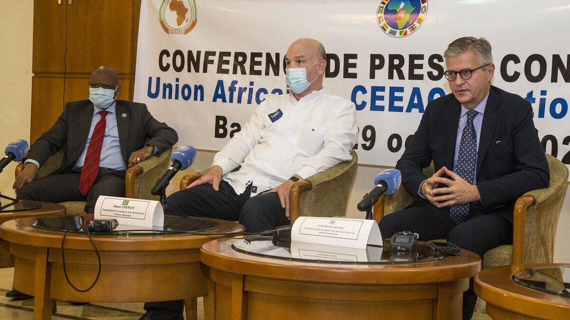 Les prochaines échéances électorales, la sécurité, la participation des femmes au scrutin, le vote des réfugiés, les différentes rencontres, les avancées sur l’Accord politique pour la paix et la réconciliation en RCA, figurent parmi les principaux sujets qui ont été évoqués lors de la conférence de presse de la délégation de l’UA, ONU et CEEAC, de ce vendredi 30 octobre 2020 à Bangui, marquant ainsi la fin de leur mission de quatre jours. Face aux médias nationaux et internationaux, l’Ambassadeur Smail Chergui, Jean-Pierre Lacroix et l’Ambassadeur Gilberto Verissimo sont revenus en détail sur leur mission en Centrafrique.