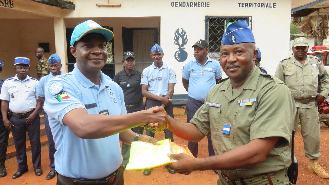 70 gilets, 10 paires de gants 1 décamètre et 1 paire de menottes, voilà de quoi est constitué le lot d’équipements remis par la Police des Nations unies à la Compagnie de circulation routière (CCR) et à la Brigade motorisée (BM) de Bangui, ce jeudi 3 octobre 2019, respectivement à la Direction générale de la Police et à la Direction générale de la Gendarmerie.