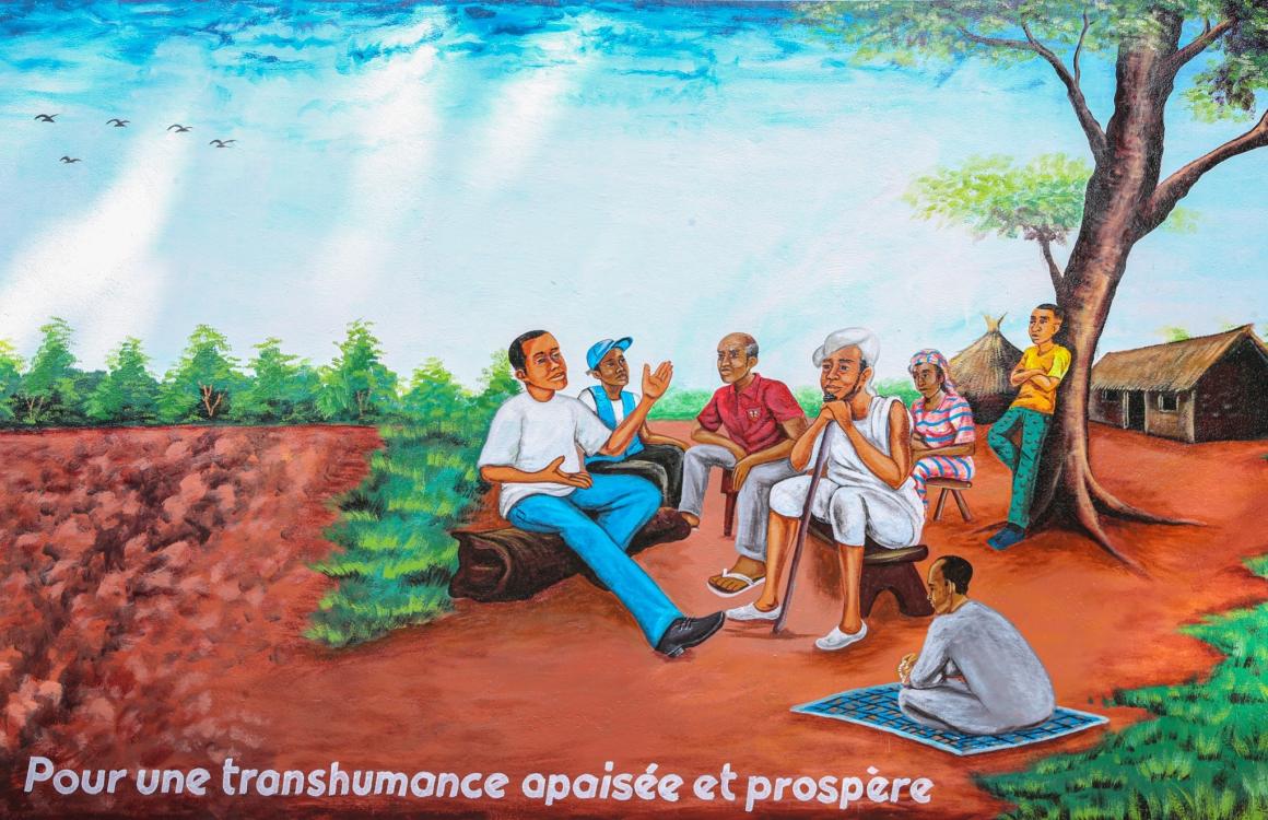 La fresque reflète les enjeux et les défis de la transhumance en République centrafricaine : d’une part, les opportunités de développement et de prospérité qu’elle représente, et, d’autre part, la recherche de solutions pour résoudre pacifiquement les conflits liés à cette pratique ancestrale.