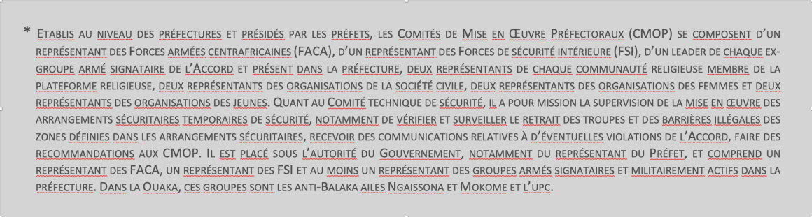 L’étape de Bambari a été marquée par le lancement officiel du Comité de mise en oeuvre préfectoral (CMOP) pour la Ouaka et du Comité technique de sécurité (CTS), deux structures prévues dans le mécanisme de suivi pour la mise en oeuvre de l’Accord de paix*.