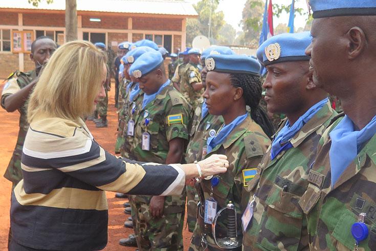 Au nom du Représentant spécial du Secrétaire général des Nations Unies et chef de la MINUSCA, Parfait Onanga-Anyanga, Mme Corner dira que « l’année 2016 commence à peine, mais s’annonce riche en promesses pour la Centrafrique ». Et de rappeler la « réussite du premier tour de l’élection présidentielle qui a indiqué que « les Centrafricains ont préféré la voie des urnes à celle des armes pour faire avancer la paix ». A ce titre, elle saluera « la contribution de la Force de la MINUSCA » au sein de laquelle le contingent rwandais a joué l’un des rôles les plus éminents, par son soutien à la protection des civils, sa participation majeure à la protection des leaders nationaux, son aptitude à mobiliser les populations locales pour des travaux communautaires, et son assistance médicale fort appréciée dans la ville de Bria. « Pour cet engagement, dira Mme Corner, acceptez notre gratitude (…) je suis fière de vous remettre la médaille des Nations Unies ».