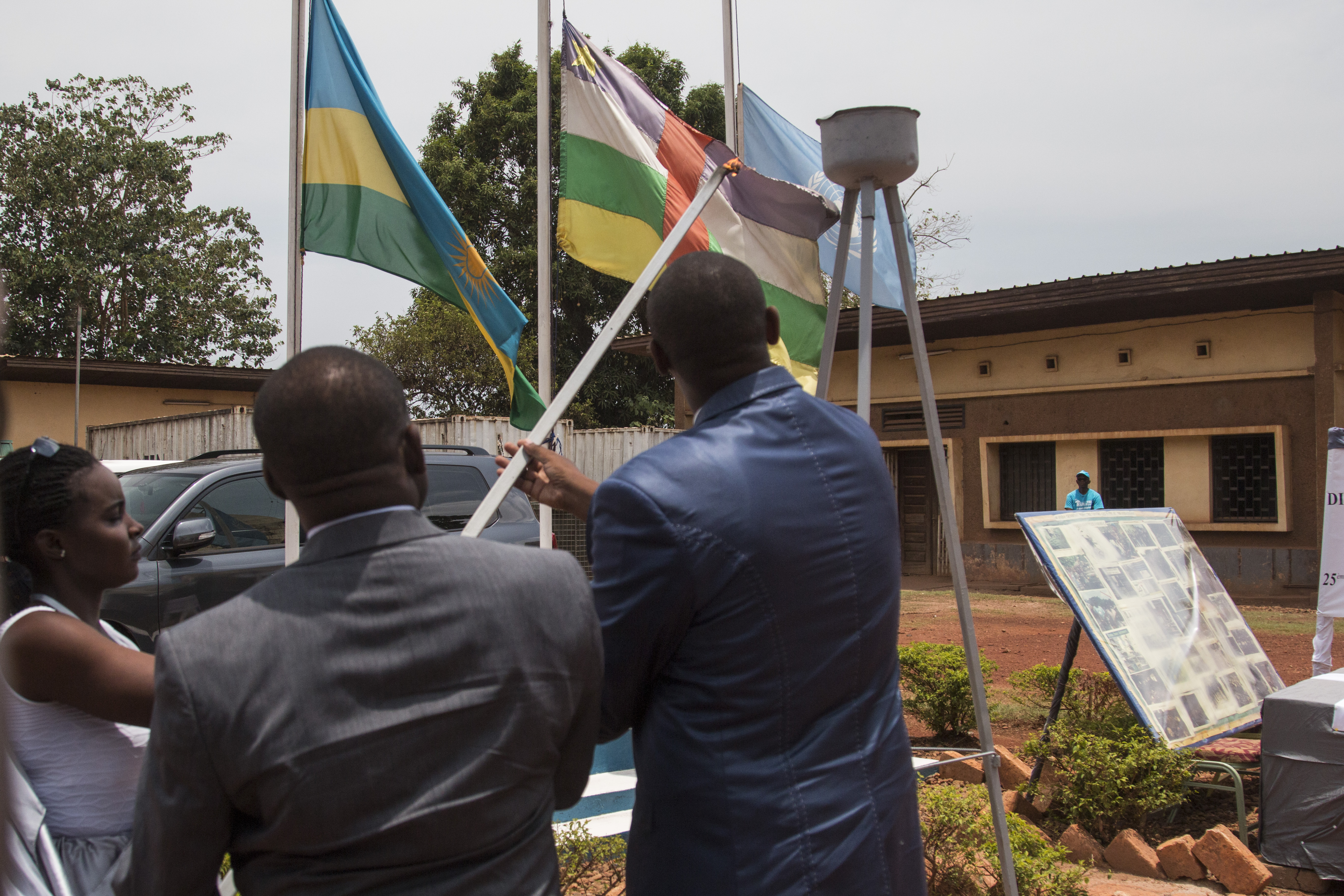 Digne et solennelle, la cérémonie a été parsemée de discours de différentes autorités, notamment du Premier ministre et chef du Gouvernement, Firmin Ngrebada, du chef de la MINUSCA, Mankeur Ndiaye, du Commandant du bataillon rwandais, le Colonel Vincent Ntazinda, ainsi que du Président de la communauté rwandaise en RCA, Nicolas Rugira. Elle a aussi donné lieu à l’allumage de la flamme du souvenir ainsi qu’à une minute de silence en hommage aux victimes. Kwibuka 25, les commémorations de ce 25e anniversaire du génocide, sous le thème du Souvenir, de l’Unité et du Renouvellement (Remember – Unite – Renew), dureront toute la semaine dans la capitale centrafricaine.