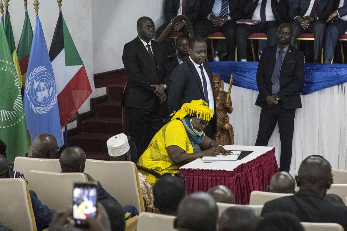 La cérémonie a eu deux parties. Une première, qui a vu se succéder les chefs de 11 sur les 14 groupes armés - 3R, Seleka rénovée, Anti-Balaka/aile Ngaissona, Anti-Balaka/aile Ngaissona, UFR-F, RJ Sayo, RJ Belanga, RPRC, FDPC, MPC et MLCJ – pour apposer leur signature au bas du texte (le FPRC, UPC, UFR l’avaient déjà signé), suivis en cela par le Président centrafricain Faustin Archange Touadéra ainsi que les garants de l’accord – l’Union Africaine (UA), les Nations unies et la CEEAC – et deux pays facilitateurs - Tchad et République du Congo. Les autres facilitateurs le feront à Addis-Abeba, à l’occasion d’une réunion du conseil exécutif de l’UA qui s’est ouverte jeudi 7 février 2019.