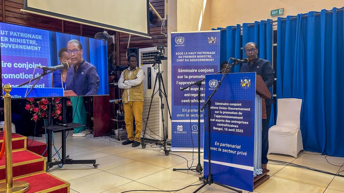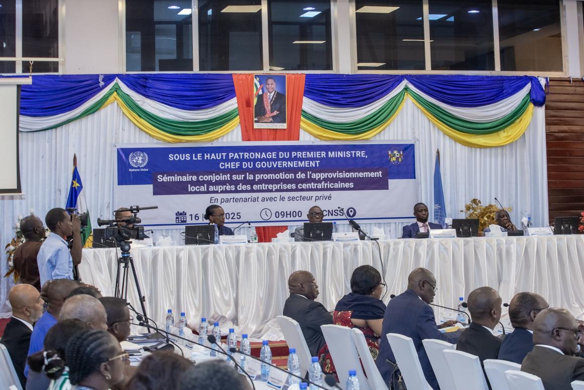 Les Nations Unies en République centrafricaine (RCA), le Gouvernement et les organisations du secteur privé centrafricain se sont réunis le 16 avril 2025 à Bangui pour échanger et proposer des recommandations visant à accroître les achats des Nations Unies sur le marché local. C’était lors d’un séminaire ouvert en présence du Premier ministre Félix Moloua, de la Cheffe de la MINUSCA, Valentine Rugwabiza, du Chef adjoint de la MINUSCA, Ag Ayoya, des représentants des agences du Système des Nations Unies, du ministre des Petites et moyennes entreprises (PME), Hippolyte Ngate-Robard, des partenaires techniques et financiers de la RCA.