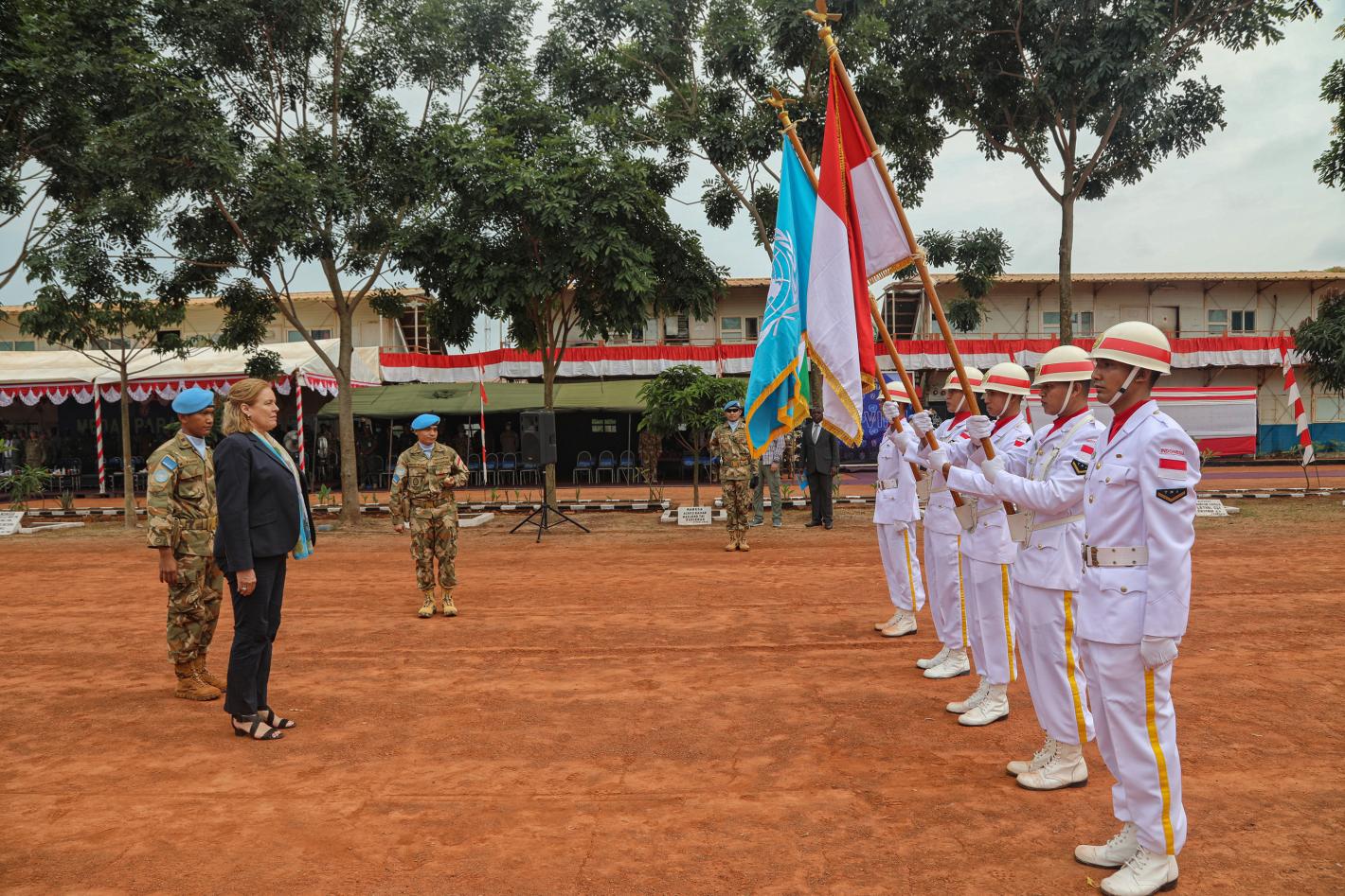 140 Casques bleus de l’Unité constituée de la police indonésienne, dont 18 femmes déployés au sein de la Minusca ont reçu la médaille des Nations Unies, le 10 aout 2022, après 11 mois de service en RCA, lors d’une cérémonie…