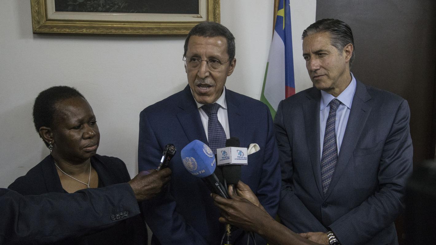 La Sous-Secrétaire générale pour l’Afrique au Département des opérations de paix, Bintou Keita, le Sous-Secrétaire général pour l’appui à la consolidation de la paix, Oscar Fernandez-Taranco, et l’Ambassadeur du Maroc à l’ONU et Président de la ‘Configuration République Centrafricaine’ de la Commission de la consolidation de la paix des Nations Unies, Omar Hilale, ont rencontré à Bangui le Président centrafricain, Faustin-Archange Touadéra.