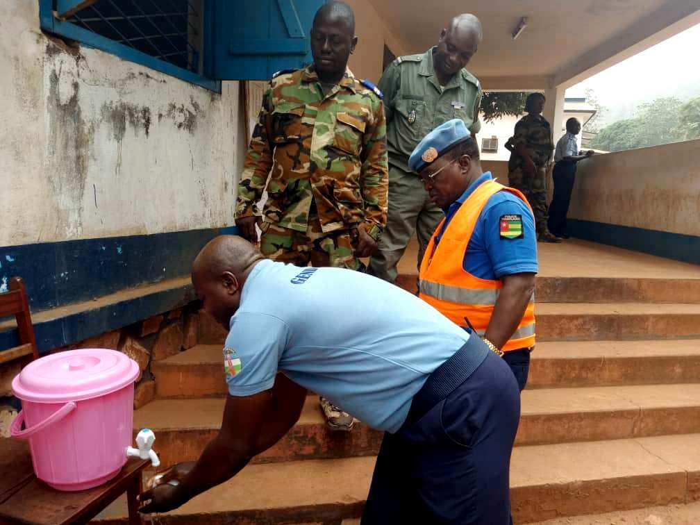 La Police de la MINUSCA accompagne fortement au processus. Elle a offert deux kits de salubrité à ses homologues du peloton motorisé et de la légion de la Gendarmerie. Don assorti de conseils sur leur bon usage et sur le lavage des mains, afin qu’ils puissent les partager avec leurs usagers. Elle a également mis à disposition six médecins et une dizaine d’infirmiers qui ont été spécialement déployés à l’Aéroport de Bangui pour appuyer les autorités nationales dans le contrôle sanitaire des passagers à l’arrivée, tout en y renforçant son équipe de colocation pour soutenir les Forces de sécurité intérieure (FSI) affectées au contrôle et à l’orientation des passagers. Par ailleurs, elle a commencé des sensibilisations au profit des FSI et intégré des mesures de prévention lors des activités de renforcement de leurs capacités, notamment dans les écoles de formation, les unités opérationnelles et les états-majors.