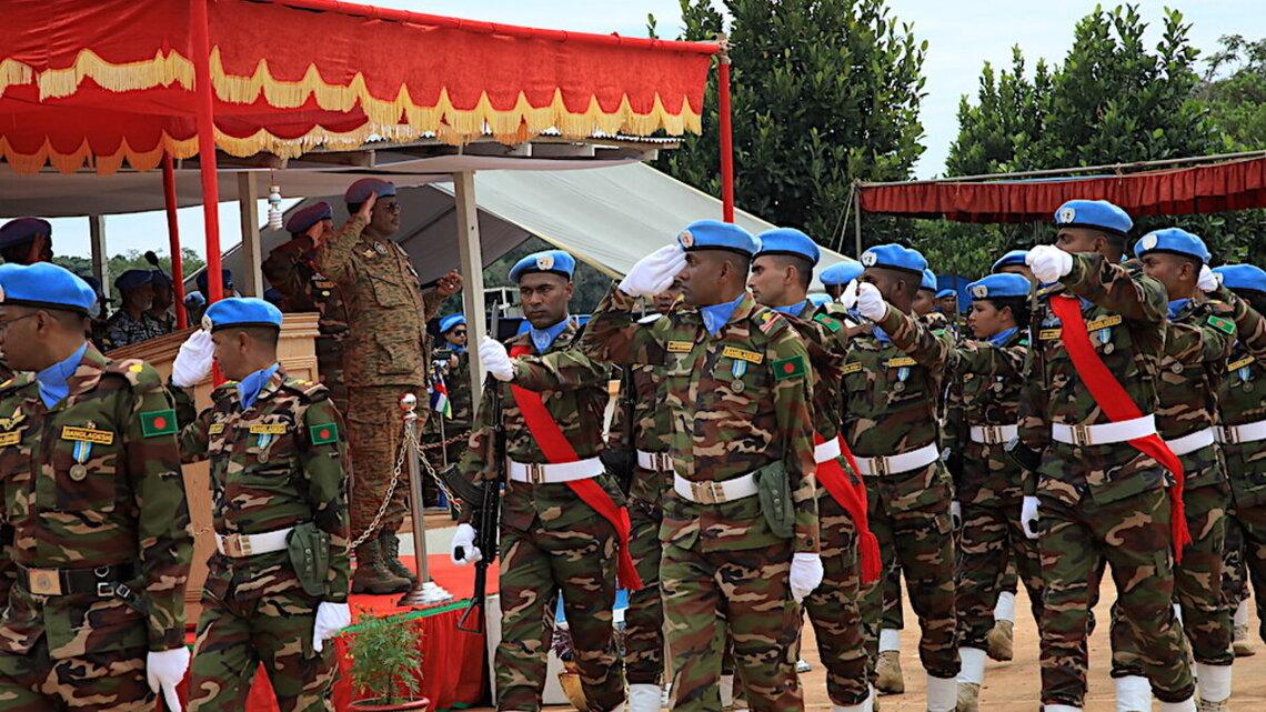 Arrivée à Bouar le 28 octobre 2021, la délégation du commandant de la Force de la MINUSCA, le général de corps d’armée Daniel Sidiki Traoré, s’est dirigée vers le camp du bataillon bangladais pour une cérémonie de remise de médailles aux officiers, observateurs militaires et sous-officiers du contingent bangladais pour leur engagement au service de la paix en République centrafricaine (RCA).