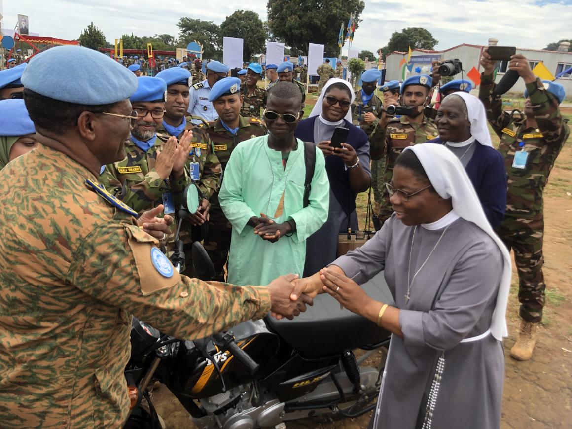 La visite du commandant de la Force de la MINUSCA a aussi été marquée par la remise de motos à des religieuses d’un centre catholique d’aide sociale aux populations et de charrettes à des femmes productrices agricoles de la localité de Bouar.