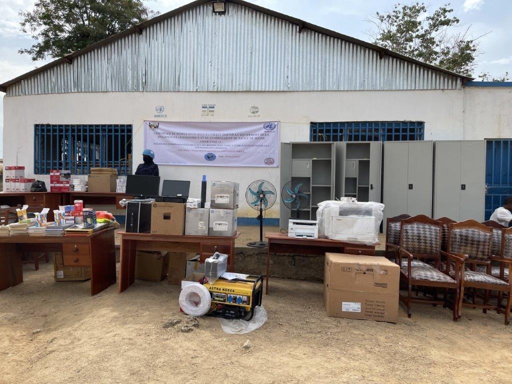 La MINUSCA, conformément à son mandat d’appui à la restauration de l’autorité de l’Etat, a remis, le mardi 5 avril 2022, un important lot de matériel bureautique et informatique, d’une valeur de 14 millions de FCFA, à la brigade territoriale de la gendarmerie et au commissariat de police de Bouar, en présence des autorités locales.