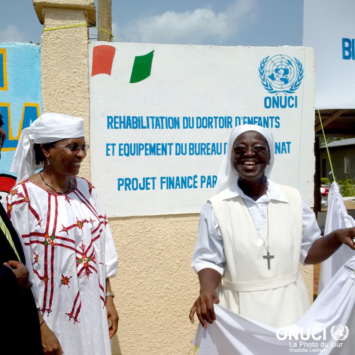 Projet à impact rapide de l’ONUCI : la Directrice de l'orphelinat ‘’ La Casa Del Sol’’ exhibe quelques pas de danse pour remercier l’ONUCI d’avoir rénové l’établissement (Tabou, mars 2016)