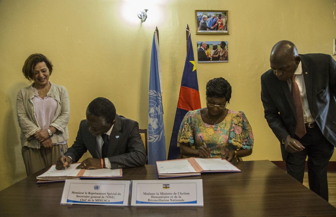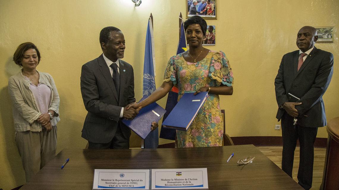 « Ce cadre de partenariat permettra désormais à nos deux entités de travailler plus étroitement. Il vient sceller notre partenariat pour appuyer le programme de réconciliation nationale du gouvernement centrafricain », a déclaré Parfait Onanga-Anyanga au cours de la cérémonie, qui a vu la présence d’officiels dudit Ministère et de la MINUSCA au nombre desquelles la Représentante spéciale adjointe du Secrétaire général des Nations Unies, par ailleurs Coordonnatrice humanitaire et de développement et Représentante résidente du PNUD, Najat Rochdi.
