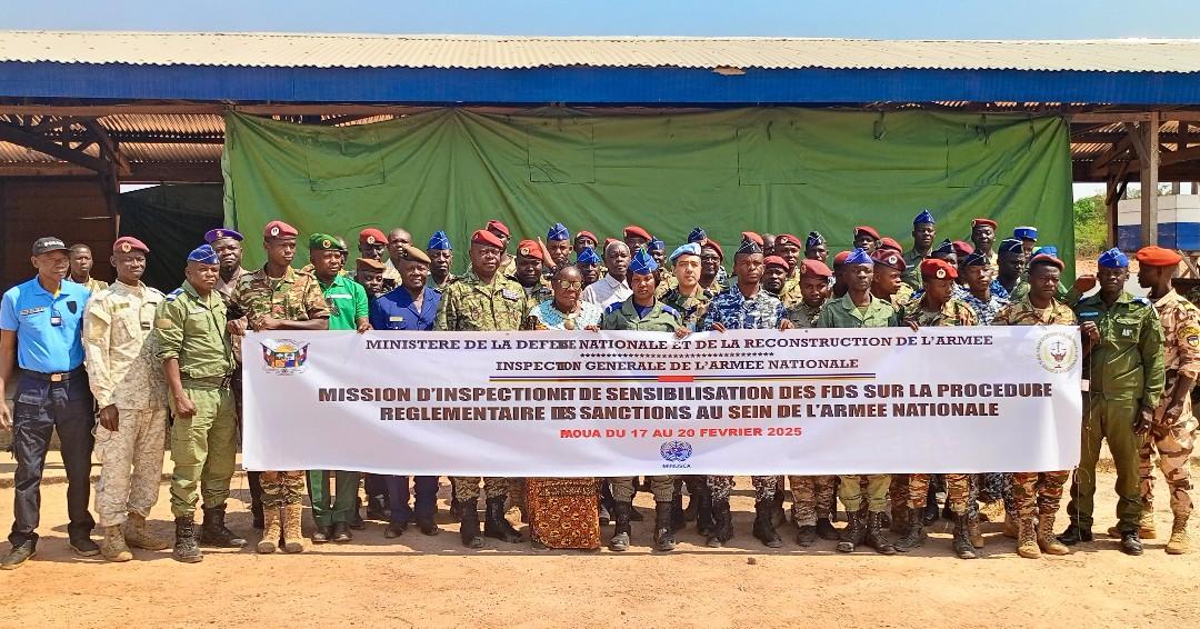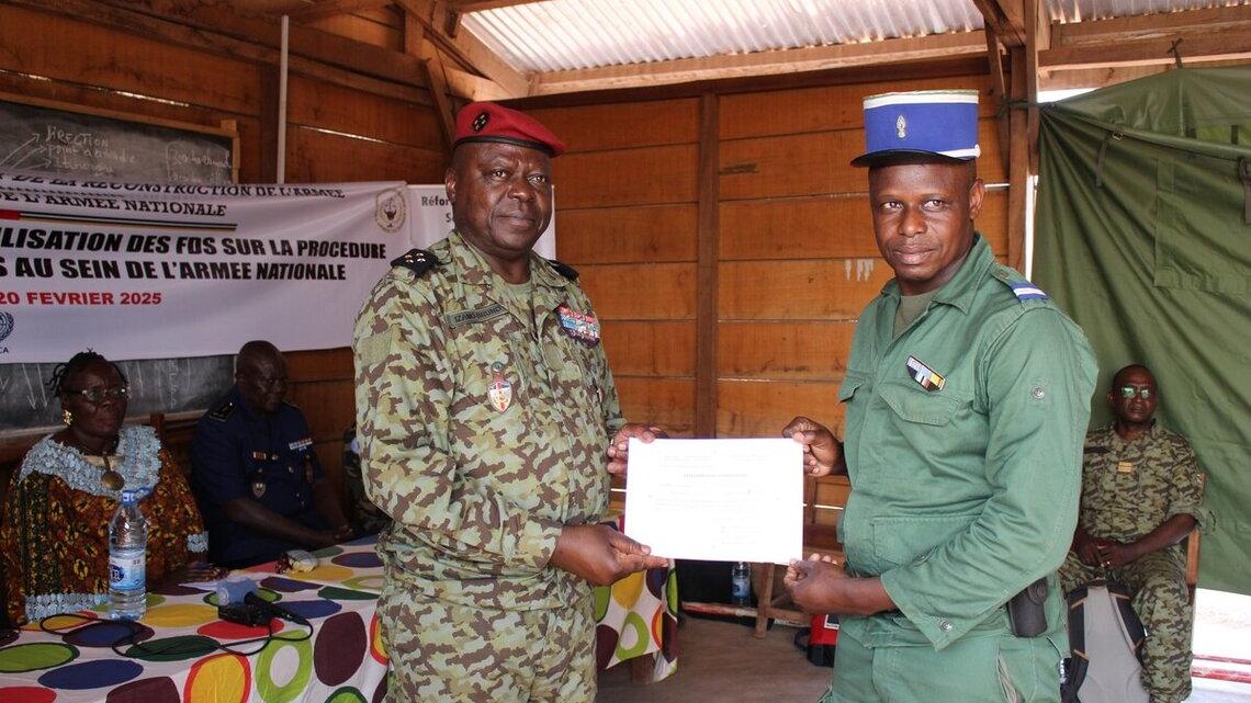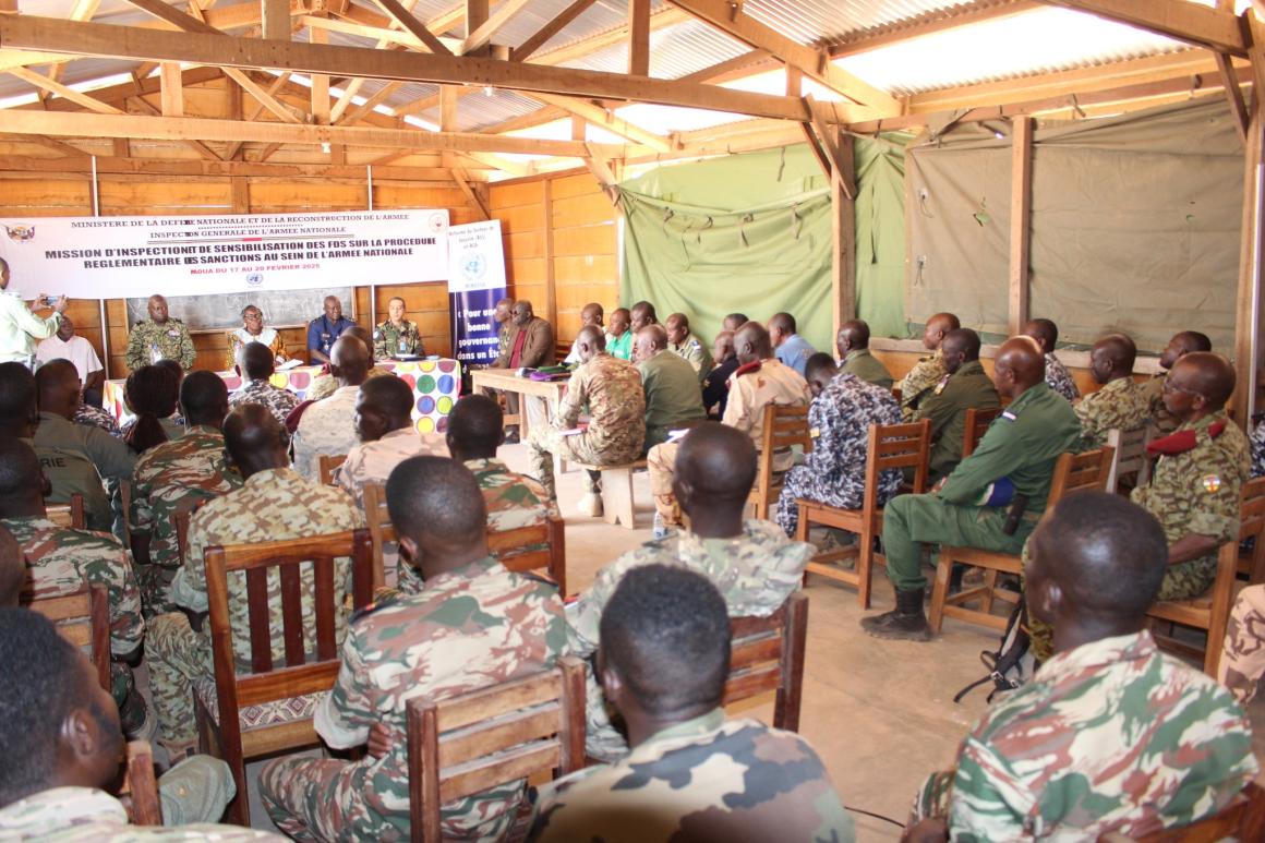 Le personnel en uniforme des forces de sécurité centrafricaines basé à Paoua, dans la préfecture de Lim-Pendé, a été formé le 18 février 2025 sur les procédures réglementaires des sanctions en vigueur dans l’armée nationale centrafricaine. Cette activité, organisée par l’Inspection générale des armées avec l’appui de la MINUSCA, visait à renforcer les compétences des agents en matière disciplinaire.