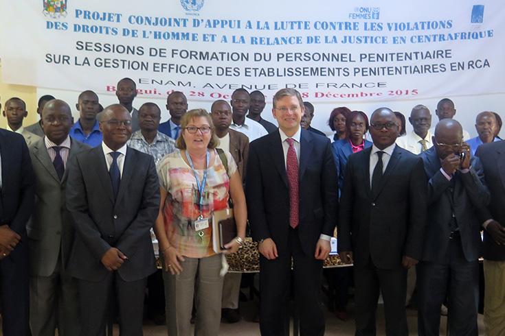 Organisé par la section des Affaires judiciaires et pénitentiaires de la Mission multidimensionnelle intégrée des Nations Unies pour la stabilisation en République centrafricaine (MINUSCA), en partenariat avec le Programme des Nations Unies pour le Développement (PNUD), ONUFEMME et le ministère centrafricain de la Justice, l’atelier de formation sur « la gestion efficace des établissements pénitentiaires en République Centrafricaine » ouvert le 26 octobre 2015, s’est achevé ce vendredi 18 décembre 2015, à l’Ecole nationale de l’Administration et de la Magistrature (ENAM) de Bangui.