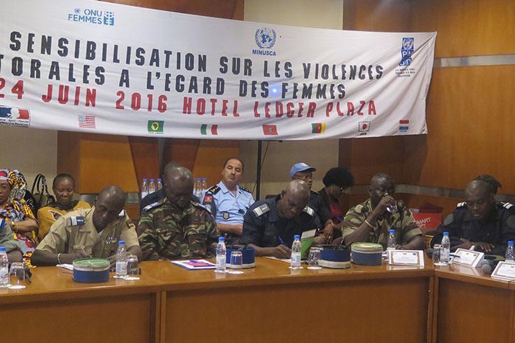 Face à cette situation et afin d’assurer la sécurité des femmes durant ce processus, quelque 35 dont des policiers, gendarmes membres de l’Autorité Nationale des Elections (ANE) se sont réunis le vendredi 24 Juin 2016 à Bangui. C’était dans le cadre d’un séminaire initié par la MINUSCA et le projet d'Appui au Cycle Electoral (PACEC) tenu sous le thème de la « Sensibilisation sur les violences électorales à l’égard des femmes ». Son objectif principal était de renforcer les capacités nationales de surveillance et de lutte contre ce type de violence. Les participants ont donc fait la typologie des violences électorales à l’égard des femmes, défini leur cadre juridique et identifiés les voies et moyens pour les prévenir et/ou les combattre.