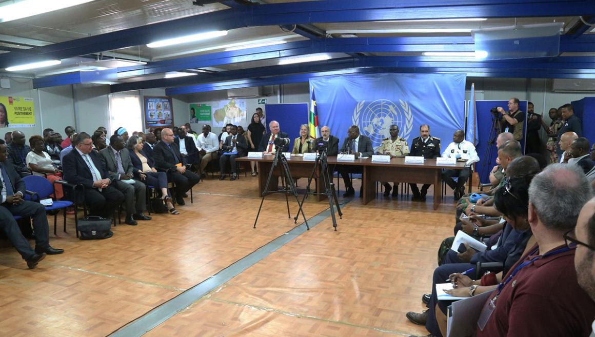 Quatre jours après sa prise officielle de fonction, le nouveau Représentant spécial du Secrétaire général des Nations Unies en République centrafricaine et chef de la MINUSCA, Mankeur Ndiaye, a eu une réunion de prise de contact, ce lundi 4 mars 2019 à Bangui, avec le personnel du siège et des bureaux régionaux de la Mission. Entouré du Représentant spécial adjoint du Secrétaire général, du Commandant de la Force, du Commissaire de Police par intérim et la Cheffe de cabinet, il a d’entrée mis l’accent sur le travail d’équipe pour appuyer la RCA.