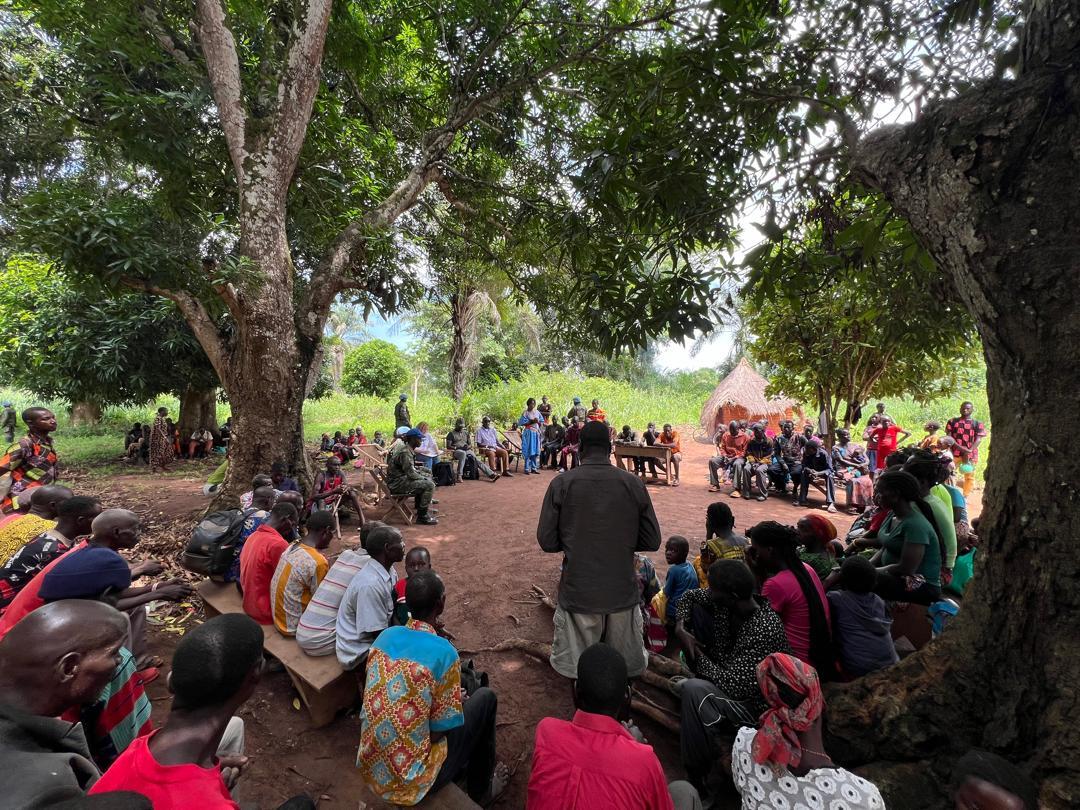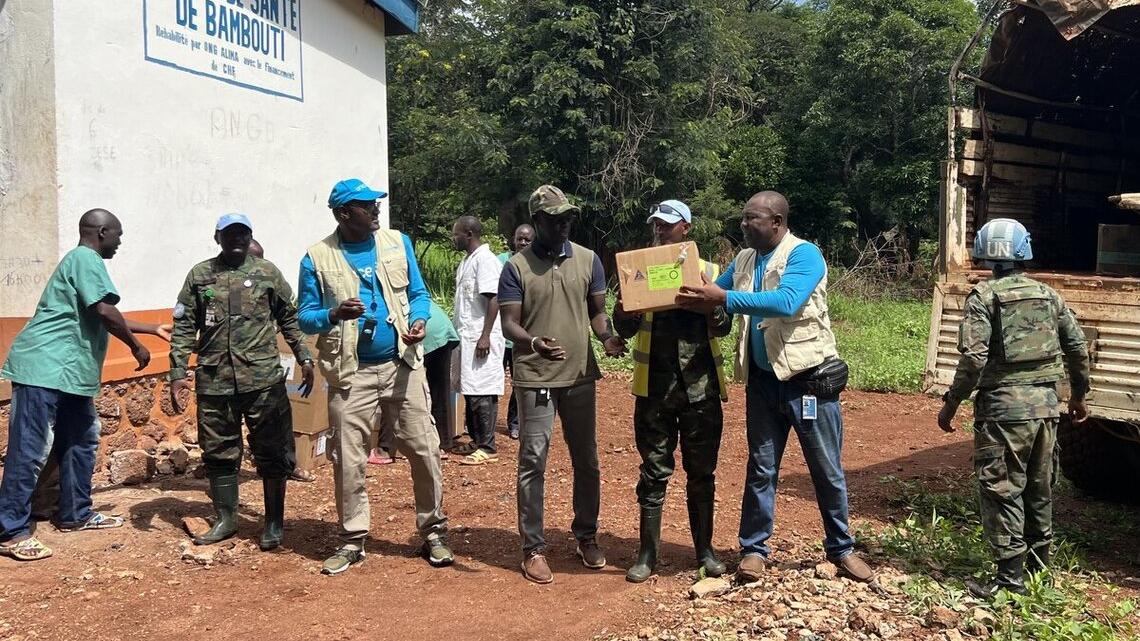 Le 12 juin 2024, une mission conjointe de la MINUSCA, de l'UNICEF, du PAM, du HCR et de Madame la Maire, Anne-Marie Sioukarani, s’est rendue à Bambouti pour rencontrer la population locale, évaluer ses besoins, et présenter les projets qui seront mis en œuvre à la suite du déploiement des Casques bleus dans la localité. Cette mission a également facilité la livraison de 338 kg de médicaments au poste de santé.