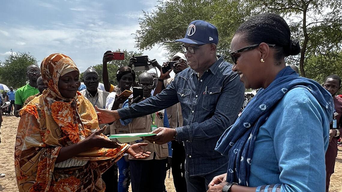 La visite au site de Korsi, qui abrite 1800 réfugiés soudanais ayant fui la guerre au Soudan, était l’un des moments forts de la mission conjointe Gouvernement-Nations Unies. Deux d’entre eux, un homme et une femme, ont reçu leur carte de réfugié des mains du Premier ministre centrafricain, Chef du Gouvernement, Felix Moloua, et de la Représentante spéciale du Secrétaire général en République centrafricaine et Cheffe de la MINUSCA, Valentine Rugwabiza.