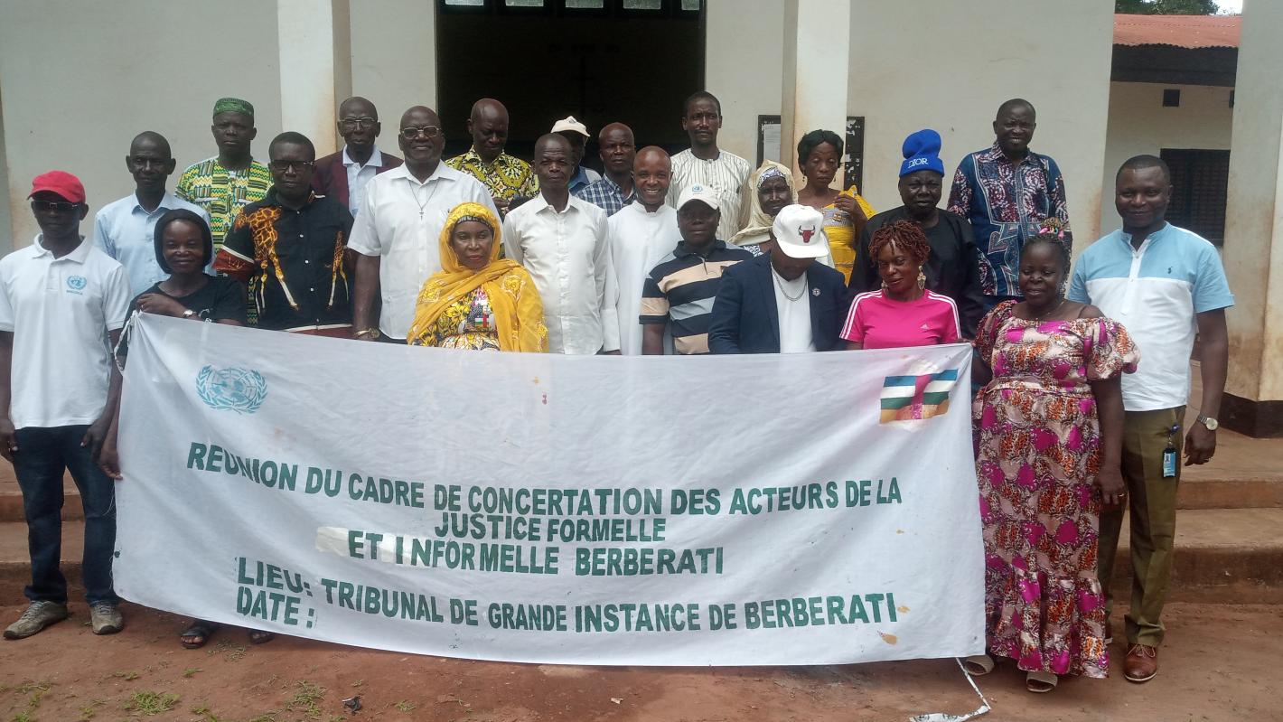 Le 26 avril 2025, la MINUSCA, en partenariat avec le Tribunal de Grande Instance de Berberati, chef-lieu de la préfecture de la Mambere-Kadei, a organisé une rencontre de concertation réunissant 25 acteurs de la justice formelle et informelle, dont six femmes. Cette initiative visait à restaurer la confiance entre ces deux secteurs et à améliorer la coordination de leurs activités judiciaires.