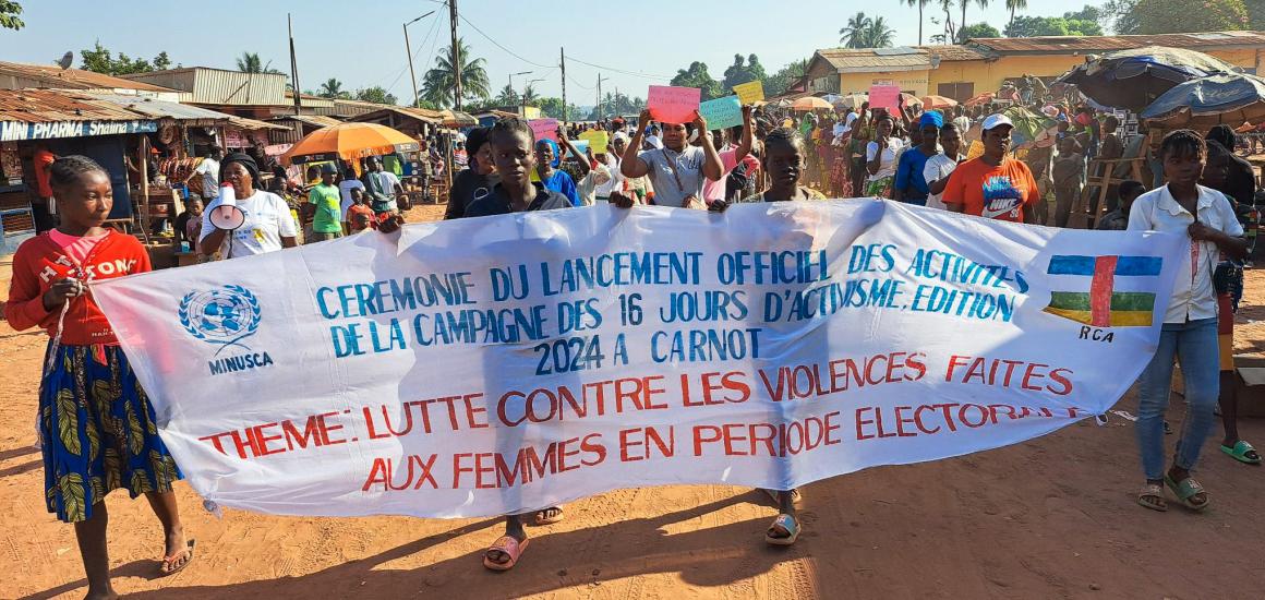 La ville de Carnot, dans la préfecture de la Mambere, a accueilli, le 25 novembre 2024, le lancement officiel de l’édition 2024 de la campagne des 16 jours d’activisme contre les violences basées sur le genre. Cet événement a rassemblé des autorités locales, des représentants religieux et communautaires, des organisations féminines, ainsi que les services techniques déconcentrés de l’État, avec l’appui de la MINUSCA en collaboration avec le service des affaires sociales. Par cette campagne, la MINUSCA et ses partenaires entendent faire avancer la lutte pour un avenir où les femmes et les jeunes filles centrafricaines pourront vivre et participer pleinement à la société, sans peur ni discrimination.